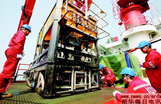 ▲3月13日,“科学”号技术支撑人员对“发现”号ROV进行下水前测试。