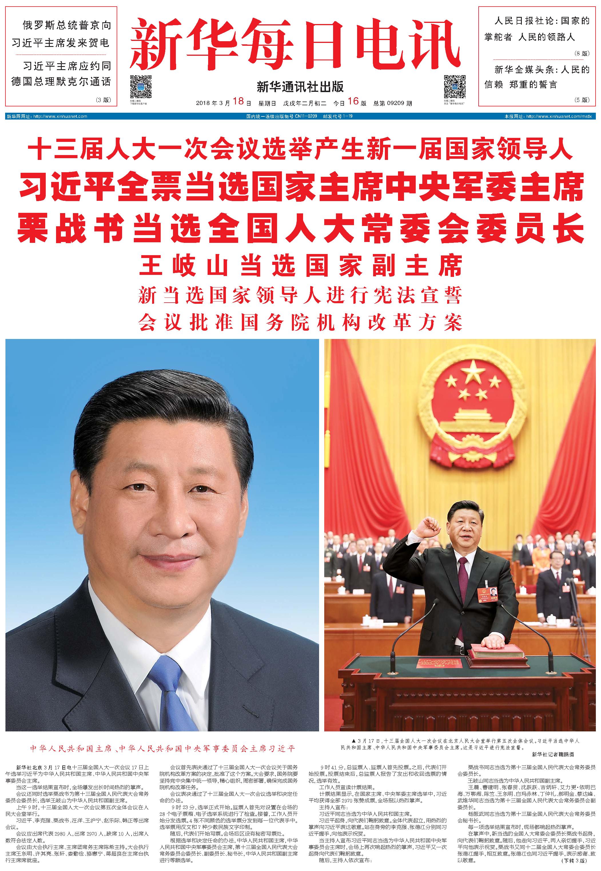 十三届人大一次会议选举产生新一届国家领导人 习近平全票当选国家主席中央军委主席 栗战书当选全国人大常委会委员长 王岐山当选国家副主席 新当选国家领导人进行宪法宣誓 会议批准国务院机构改革方案