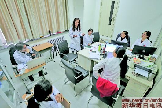 ▲在沈阳医学院附属第二医院,李潞(左三)与同事交流(2月28日摄)。