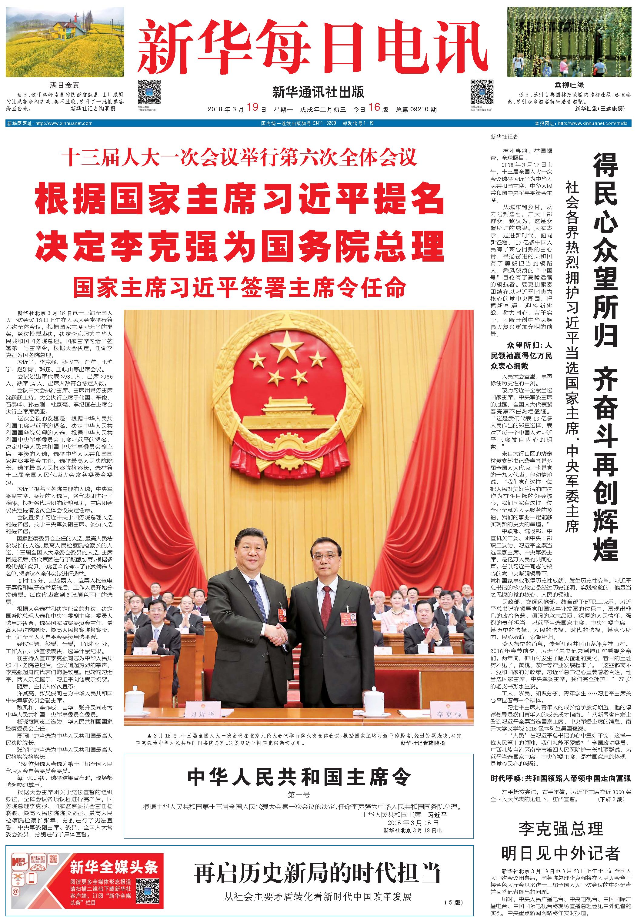 十三届人大一次会议举行第六次全体会议 根据国家主席习近平提名 决定李克强为国务院总理 国家主席习近平签署主席令任命