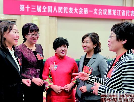 这是孙艳玲(中)与黑龙江代表团其他代表交流(3月10日摄)。新华社记者杨宗友摄 |