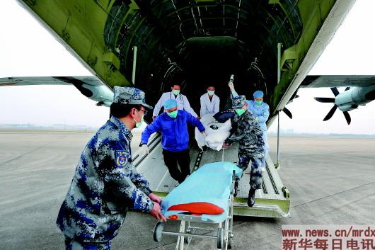 运-9飞机抵达成都后,机组和医护人员迅速把西部战区空军某部正连职参谋王远转移下飞机(3月3日摄)。新华社发(刘畅摄)
