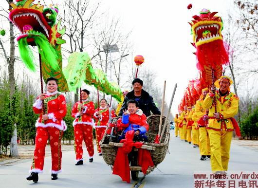 ▲3月17日,山东省淄博市临淄区孙营村村民参加“农事节”。当日,淄博市临淄区孙营村举办“农事节”活动,人们在村里表演舞龙,体验传统农事,迎接春天的到来。