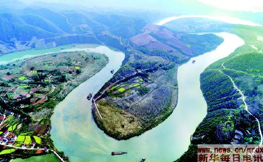 汉江从陕西省汉中市宁强县汇溪成源,在西乡县的回龙湾展现浩荡壮美气势。阳春三月,回龙湾山清水秀,春风荡漾。 新华社记者陶明摄