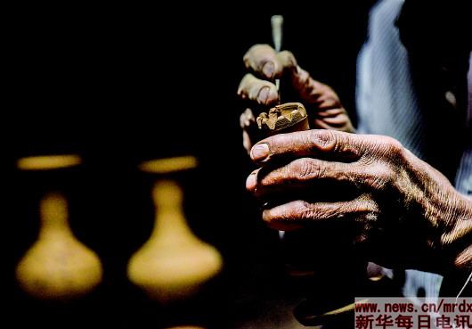 ▲吐尔逊·祖农在喀什老城的家中给土陶上色(3月14日摄)。 |