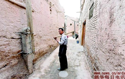 ▲吐尔逊·祖农准备拿起工具去老城边的吐曼河取土(3月14日摄)。