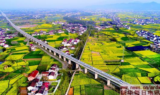 ▲3月21日,一列动车正通过陕西省汉中市南郑县新集镇油菜花海(无人机拍摄)。