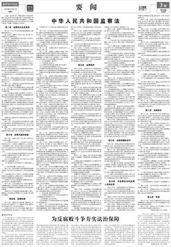 十三届全国人大一次会议表决通过的《中华人民共和国监察法》26日全文公布。制定监察法,是贯彻落实党中央关于深化国家监察体制改革决策部署的重大举措,是坚持和加强党对反腐败工作的领导,构建集中统一、权威高效的国家监察体系的必然要求,是坚持走中国特色监察道路的创制之举,是推进国家治理体系和治理能力现代化的战略举措,具有重大现实意义和深远历史意义。