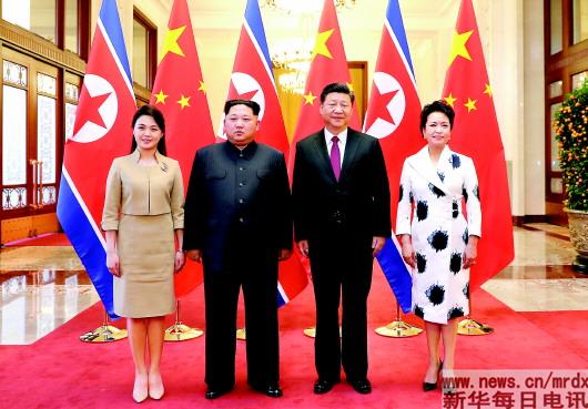 3月25日至28日,应中共中央总书记、国家主席习近平邀请,朝鲜劳动党委员长、国务委员会委员长金正恩对我国进行非正式访问。访问期间,习近平同金正恩举行会谈。这是习近平和夫人彭丽媛在人民大会堂同金正恩和夫人李雪主合影。