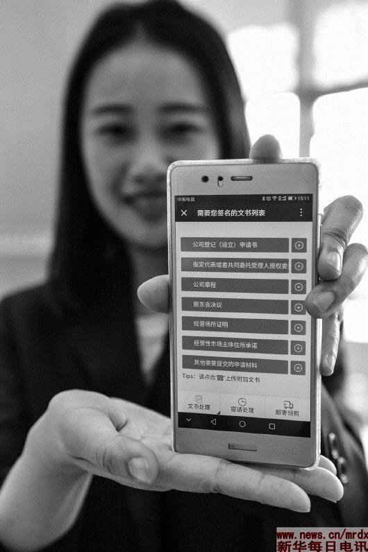 3月29日,在南京市栖霞区商事登记服务大厅,工作人员展示以微信公众号为平台的“不见面审批”系统。 |