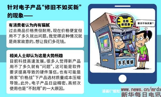 新华社银川3月29日电(记者杨稳玺)近年来,各类电子产品、生活用品年年“推陈出新”:花样越来越多、价格日益亲民;加上网购方便快捷,让“买买买”成为一种“潮流”。但与此同时,不少产品维修时却遭遇了修旧不如买新甚至修比买贵的尴尬局面。这究竟是商品质量下降、维修乱收费等猫腻导致,还是社会发展大势? 尴尬:修旧不如买新 “手机从兜里不小心摔地上,屏幕就裂了,换屏得好几百。”宁夏银川市的闫励最近比较“郁闷”,用了两年不到的千元手机屏裂了,想修觉得贵,买新手机又觉得浪费。