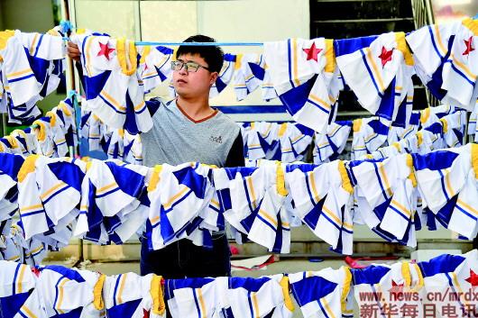 ▲在山东曹县大集镇金典服饰公司,张洪征在收拾晾晒的衣服(3月27日摄)。张洪征2011年从菏泽医学专科学校毕业后返乡从事网店生意。 |