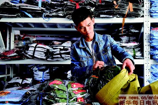 ▲在山东曹县大集镇朝阳服饰公司,姜彪在为客户备货(3月27日摄)。姜彪2012年从山东大学毕业后返乡从事网店生意。