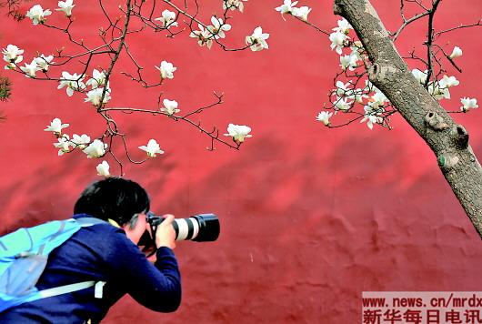 4月1日,游客在北京长安街拍摄红墙前的玉兰花。北京街头的各种花卉陆续开放,众多市民纷纷走出户外,踏青赏花。 新华社记者罗晓光摄