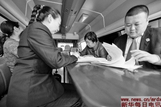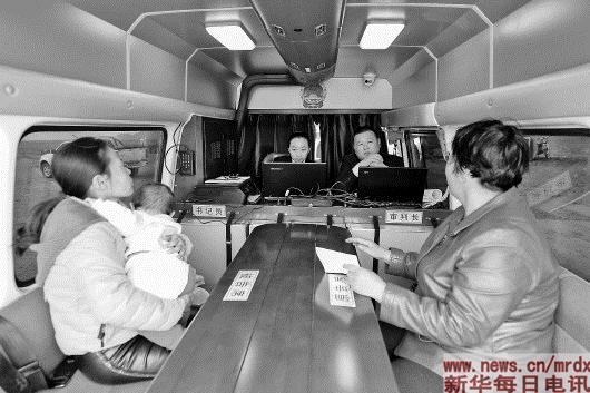 乌拉特中旗流动法庭工作人员在流动法庭车上为牧民调解民事纠纷(3月27日摄)。