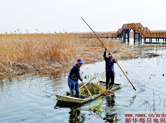 工人在白洋淀景区内清理漂浮物(3月29日摄)。本报记者牟宇摄