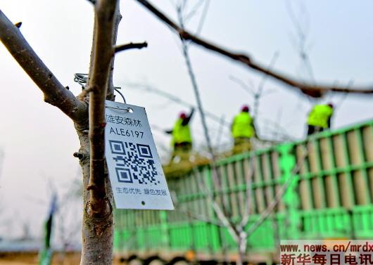 这是河北雄安新区“千年秀林”栽植苗木上的二维码(3月21日摄)。本报记者牟宇摄