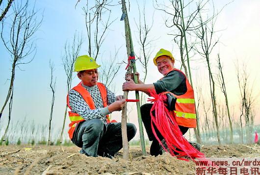 工人在河北雄安新区“千年秀林”施工现场用竹竿固定树苗(3月30日摄)。本报记者牟宇摄