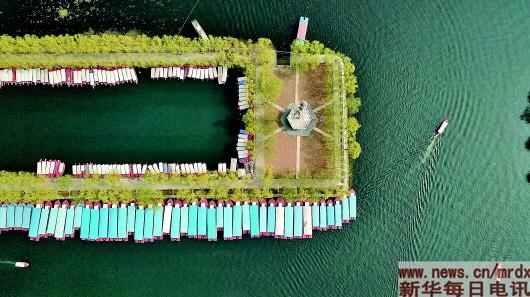 游船在白洋淀旅游码头内行驶(3月30日无人机拍摄)。本报记者牟宇摄