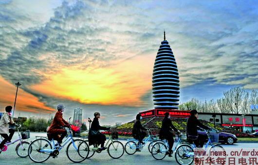 市民在河北雄安新区容城县县城道路上骑行(3月29日摄)。本报记者牟宇摄