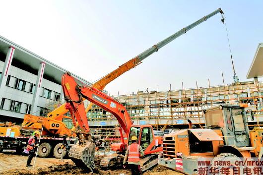 建筑工人在“雄安城建第一标”——市民服务中心施工现场施工(3月21日摄)。本报记者杨世尧摄