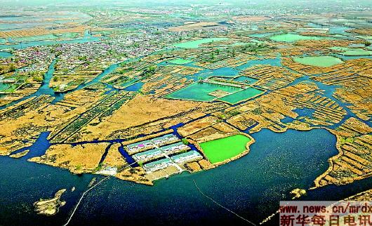 4月的白洋淀,碧水映天,片片芦苇黄中泛青。
