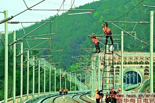 3月30日,施工人员在杭(州)黄(山)高铁浙江桐庐段调整接触网导线。杭黄高铁预计年内建成通车。