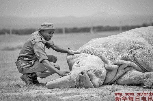 3月30日,在肯尼亚奥尔佩杰塔自然保护区,养护人员抚摸雌性北方白犀牛“那金”。肯尼亚旅游部3月31日在该国北部的奥尔佩杰塔自然保护区举行活动,纪念地球上最后一头雄性北方白犀牛“苏丹”离世。肯尼亚旅游部长纳吉布·巴拉拉出席纪念活动。