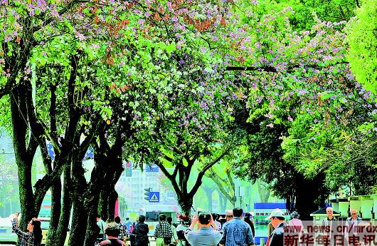 4月3日,盛开的羊蹄甲吸引福州市民驻足拍摄。近日,福州的羊蹄甲行道树进入花期,一派春意盎然的景象。