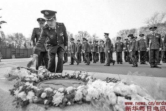 ▲4月2日,辽宁公安边防总队官兵在沈阳抗美援朝烈士陵园内向纪念雕塑献花。