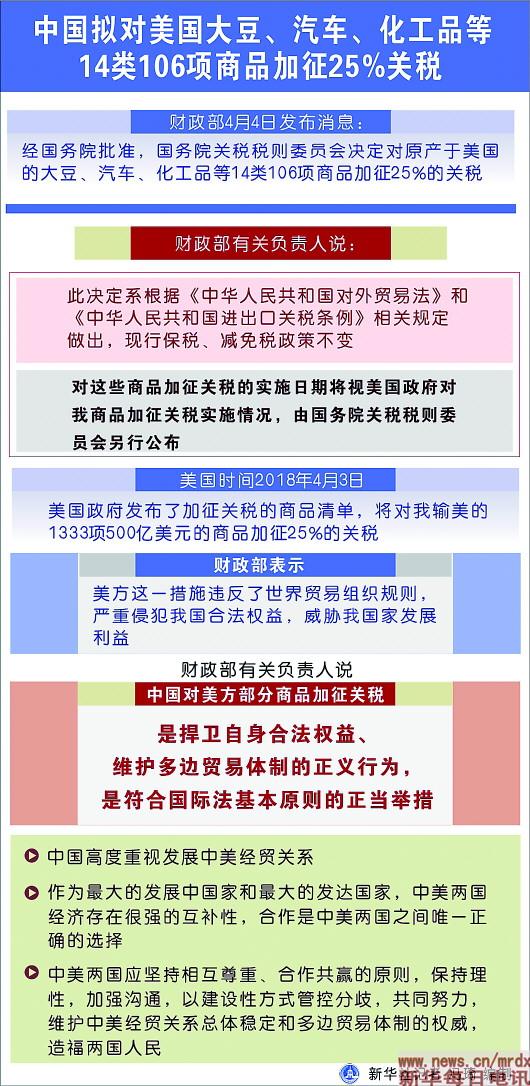 中方“亮剑”合理合法,是被迫的、克制的 针对美国的举措,中方于4日采取了对等措施:将对原产于美国的大豆、汽车、化工品、飞机等进口商品加征25%的关税,涉及2017年中国自美进口金额约500亿美元。