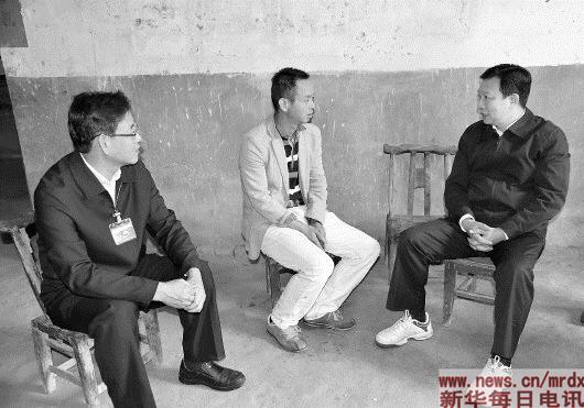 ▲杨汉军(右)在武汉市新洲区调研精准扶贫和灾后重建工作(2016年10月14日摄)。新华社发