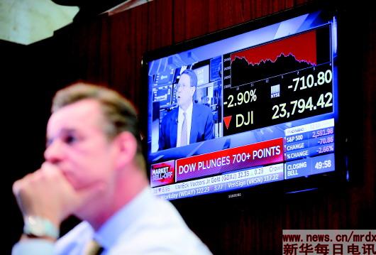 受中美经贸冲突影响,6日纽约股市三大股指道琼斯工业平均指数、标准普尔500种股票指数、纳斯达克综合指数分别比前一交易日下跌2.34%、2.19%和2.28%,其中道琼斯指数盘中一度暴跌逾700点。