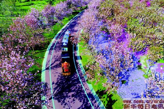 4月8日,观光小火车行驶在江苏南通洲际绿博园。日前,江苏南通洲际绿博园鲜花争艳,宛如铺上别具风格的“地毯”。