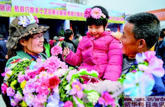 一位小朋友在汉中油菜花节主会场被“巧娘手工艺品”花束吸引(3月19日摄)。 |