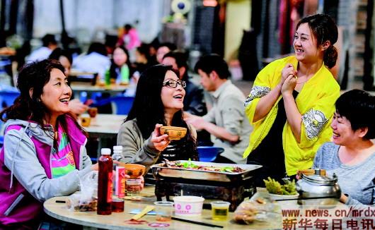 | 汉中市宁强县青木川镇农家乐经理陈小梅(右二)在为顾客服务(4月4日摄)。遍及汉中城郊、乡镇、山村的农家乐,让游客品尝了地方风味,也增加了农户收入。