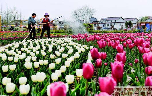 | 村民在汉台区虹彩花园为郁金香浇水(3月23日摄)。该花园广泛吸纳当地农民就近打工,带动辐射周边村镇160户农民从事花卉苗木生产,促进农民增收。