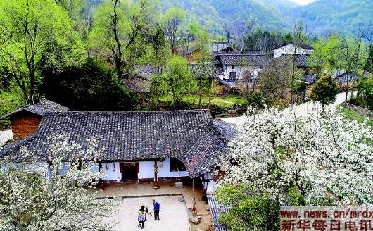 旅游者在汉中市西乡县子午镇回龙村探访鲜花盛开的农家小院(3月24日无人机航拍)。 |