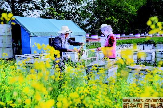 蜂农金玉祥(左)在汉中市勉县定军山镇杨家山村油菜花田里整理蜂箱(4月1日摄)。乡村旅游加快了当地土蜂蜜的流通,蜂蜜的价格也有所提高,许多群众因此而脱贫致富。