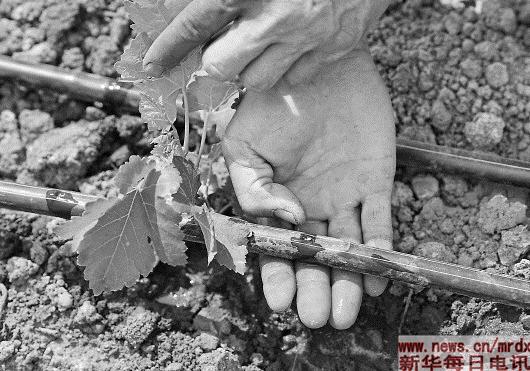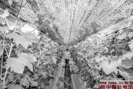 在云南省楚雄彝族自治州元谋县清和社区,村民余树云在自家利用智能水表控制的高效节水滴灌葡萄园里(4月4日摄)。