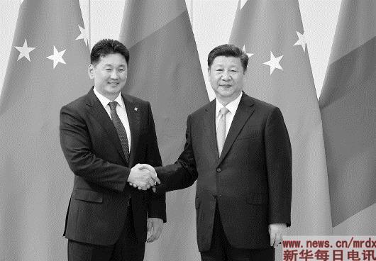 习近平指出,中方始终将中蒙关系放在周边外交重要位置。我们将推动建设人类命运共同体,继续按照亲诚惠容理念和与邻为善、以邻为伴的周边外交方针,深化同蒙古国的关系。当前,中蒙关系处在新的历史阶段。双方要本着互信、合作、共赢原则,抓住机遇,推动中蒙全面战略伙伴关系向前发展。
