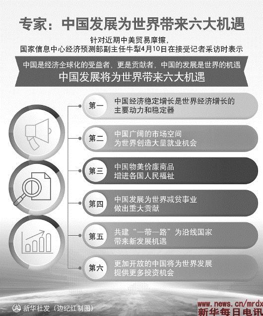 新华社北京4月10日电(记者安蓓、申铖)针对近期中美贸易摩擦,国家信息中心经济预测部副主任牛犁10日在接受记者采访时表示,中国是经济全球化的受益者,更是贡献者,中国的发展是世界的机遇。 他说,多年来,中国经济增长是全球经济增长的动力之源、稳定之锚。近14亿人的广阔市场空间、上亿人次出国旅游以及高达千亿美元的对外直接投资等,为各国提供了良好的市场机遇和投资机遇,创造了大量就业机会。中国物美价廉的商品有效抑制了世界通胀水平,为改善各国人民福祉作出了巨大贡献。总的来说,中国发展将为世界带来六大机遇。