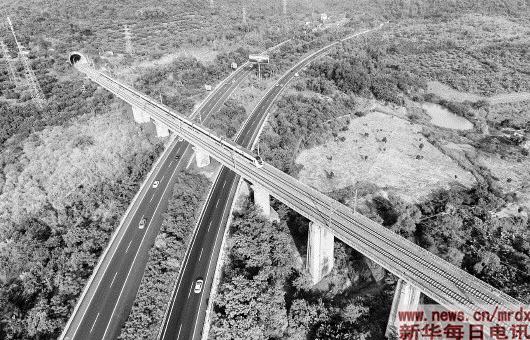 ▲航拍海南环岛高铁东线三亚段(2016年10月11日摄)。