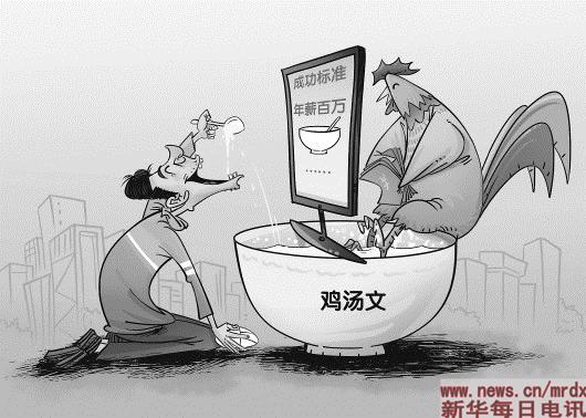 近几年,随着微信公号成为人们获取信息的主要渠道之一,各种“鸡汤文”日渐泛滥。有些作者为制造阅读量超“10万+”的爆款,一有机会就向读者兜售“碾压同龄人才能叫成功,平凡的人毫无价值”的扭曲价值观,总希望读者认为“别人的成功=自己的失败”。种种套路化写作背后,是卖焦虑已成一门生意的现实——越制造焦虑就越能撬动流量,吸引粉丝,接到广告订单。
