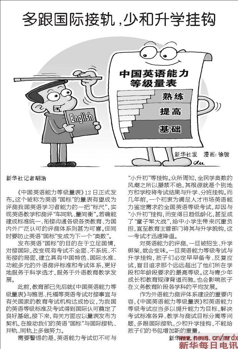 作为外语能力测评体系建设的重要内容,《中国英语能力等级量表》和英语能力等级考试应当多以提升能力为目标,解决考试标准各异、教学与测试目标分离等问题,多跟国际接轨,少和升学挂钩,不能给孩子们的书包增加新的重量。