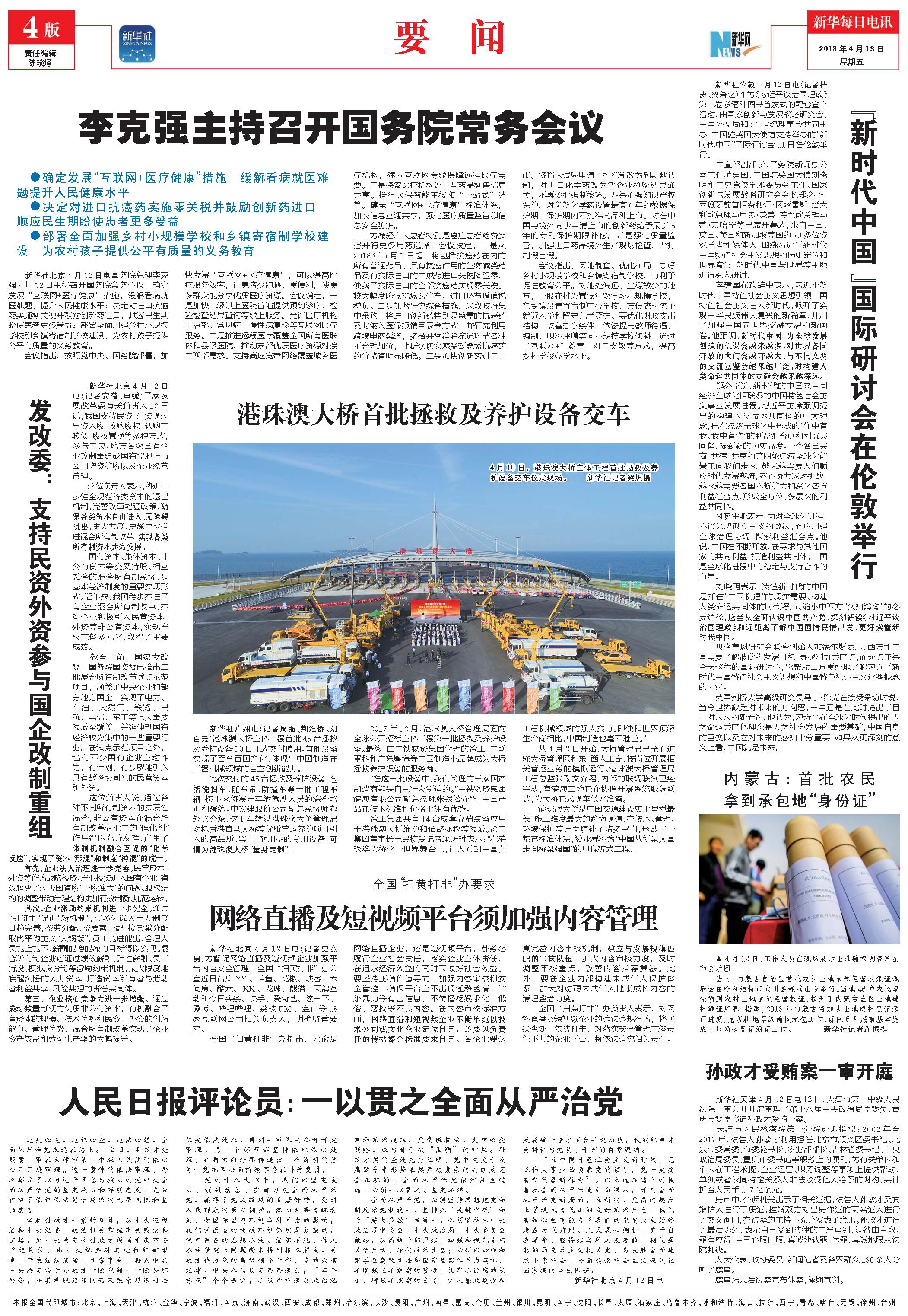 发改委:支持民资外资参与国企改制重组 (2018年04月13日) |