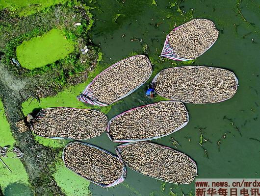 4月15日,在江苏省海安县墩头镇新舍村,藕农采收浅水藕。日前,江苏省海安县墩头镇浅水藕种植基地内一片繁忙。