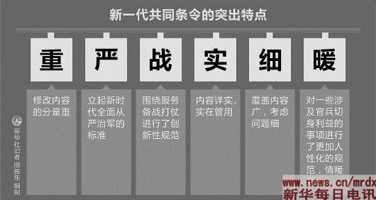 新华社北京4月15日电(记者黎云、刘济美)解放军新一代共同条令日前发布,并将于5月1日起正式施行。记者从中央军委训练管理部采访获悉,“重、严、战、实、细、暖”6个关键词,是新一代共同条令的突出特点。 “重”是指修改内容的分量重。共同条令作为全军一体遵循的基础性法规,其作用不仅在于为军人的行为提供规范,为部队日常管理提供依据,更重要的还在于为坚持人民军队的性质宗旨,确保军队建设坚定正确的政治方向提供保证。这次共同条令修订最核心的是,将习近平强军思想写入条令,通篇贯穿、处处体现,以军队基本法规的形式固化下来,为全面依法治军、加强军队正规化建设、统一全军意志和行动提供了根本指导和基本遵循,可见分量之重。