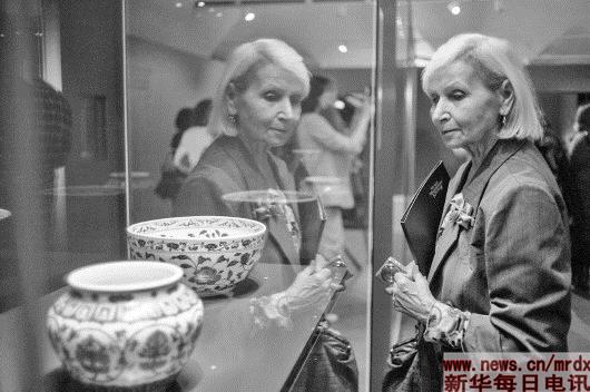 4月16日,在俄罗斯首都莫斯科的克里姆林宫博物馆,一名参观者欣赏展出的瓷器。当日,《大明王朝—文人时代的光辉》明代文物主题展览在莫斯科克里姆林宫博物馆开幕。本次展览共展出包括字画、瓷器在内的80余件展品。
