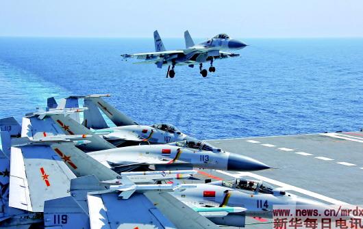 歼—15舰载战斗机在辽宁舰进行训练(资料照片)。